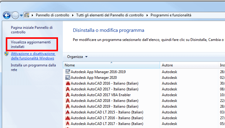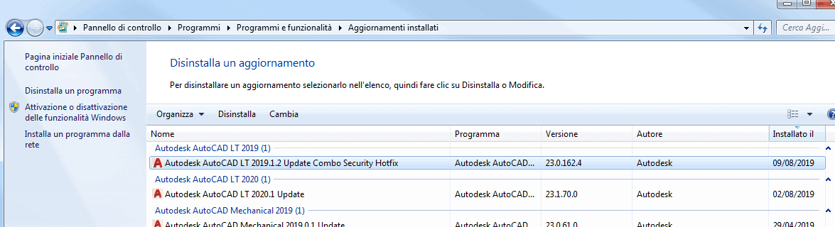 - Disinstalliamo l'Update Combo Security della nostra versione di AutoCAD LT